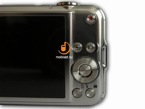 На задней панели расположен 2,7-дюймовый экран с разрешением 230 тысяч пикселей. Дисплей не самый яркий (этим грешат все компакты), но для более-менее комфортной съемки при ярком освещении его хватает.