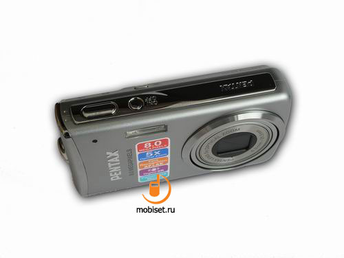 По своим габаритам Pentax Optio M50 Casio: 95 х 55 х 23,5 мм при весе 115 граммов. Любителям slim-аппаратов это не понравится, зато ситуация с эргономикой в данном случае лучше: аппарат остается достаточно небольшим и легким, чтобы его можно было с удобством носить в кармане, а свободного места на «тушке» вполне достаточно для размещения управляющих элементов. В дизайне ЦФК доминируют прямые линии, немного сглаженные по бокам. Заметен и небольшой изгиб боковых панелей. Pentax Optio M50 выпускается в нескольких вариантах расцветки: черной, голубой двух оттенков, красной, розовой и классической серебристый.