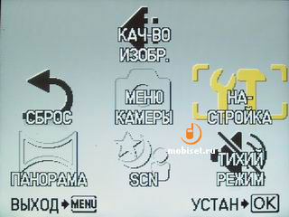 Все установки и опции можно менять в неплохо скроенном меню. Оно разделено на две закладки: съемка и установки. Первая позволяет менять все связанные с процессом съемки параметры. Вторая – менять настройки дисплея, устанавливать дату, язык, опции звука и т.д.