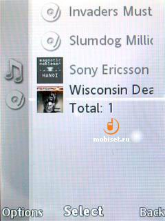 Под строкой отображается прошедшее и оставшееся время проигрывания трека, информация из ID3–тега и обозначения действий на навигационной клавише. Нажатиями вверх или вниз вызывается текущий список воспроизведения, затмевающий наполовину активное окно воспроизведения. При изменении ориентации на альбомную, обозначение навигационной клавиши наплывает на правый край строки прокрутки.