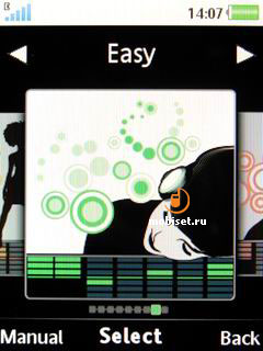 Вместо классического вертикального списка, нам предлагается выбрать одну их 9 надстроек пяти полосного эквалайзера, оформление которых вполне соответствует имиджевому музыкальному решению. Каждая надстройка расположено в крупном окошке со схематичным образом слушателя, названием музыкального жанра и демонстрацией значений полос эквалайзера.