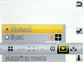 Интерфейс по работе с камерой выполнен в привычной стилистике, так что можно сразу же перейти к описанию разделов меню съёмки, с режимами, регулировкой баланса белого и цветовых эффектов, настройкой вспышки и сменой режима автофокуса. Также можно выбрать разрешение снимка (3262 x 2448, 2592 x 1948, 1600 x 1200, 640 x 480), сменить пользовательскую сцену, выбрать режим Best Pic, установить таймер съёмки, сменить замер экспозиции с матричного на центральный, а в довершении перейти к настройкам камеры.