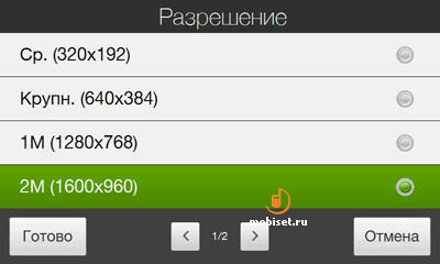 Что же касается всевозможных мелочей по настройке режима съёмки, тут всё собрано несколько хаотично, в результате чего касание по ярлыку настроек приводит разве что к вызову небольшой панельки с регулировкой режима камеры, где можно выбрать запись видео, подстройку параметров для отправки картинки по MMS, а также включить панорамный режим съёмки. Все остальные регулировки собраны в меню настроек, где найдётся всё, начиная со смены разрешения снимка, и заканчивая регулировкой звука электронного затвора.