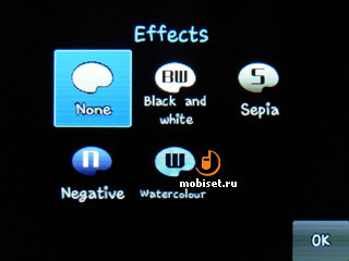 В настройках можно настроить качество сжатия снимка, сменить метод замера экспозиции, выбрать цветовые эффекты, установить таймер съёмки, а заодно выбрать разрешение кадра (1600 x 1200, 1280 x 960, 640 x 480). Помимо этого есть закладка общих настроек, где имеется возможность сменить звук затвора, включить просмотр полученного снимка, а также повесить решётку облегчения композиции кадра.