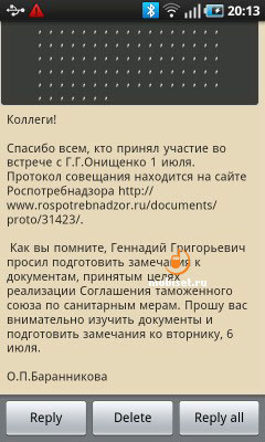 Поддерживается копирование и вставка текста. Возможности почтового клиенты включаются в себя масштабирование изображения при помощи пальцев – мультитач прост и удобен. Можно менять фон оформления при просмотре писем. Смартфон дает возможность просмотра прилагаемых к письму файлов известных ему типов (например, изображения или офисные документы). При отправке почты есть функция добавления во вложения разнообразных файлов.