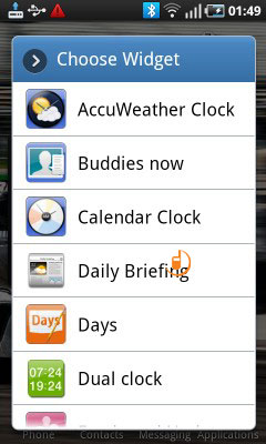 Предлагаются 8 виджетов от Samsung, это: AccuWeather Clock, Buddies now, Calendar clock, Daily Briefing (прогноз погоды вместе с финансовыми сводками и уведомлениями о грядущих событиях из календаря), Days (можно добавить текст и изображение, красивое оформленная напоминалка о событиях), Dual clock, Feeds and Updates (выводятся последние новости и сообщения из Facebook, MySpace и Twitter), Yahoo! Finance Clock.