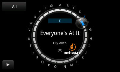 Ярлык вверху экрана вызывает круг с буквами – это начальные буквы названий альбомов или треков (в зависимости от того, какой принцип упорядочивания выбран). Прокручивая его пальцами, можно быстро найти искомый альбом.