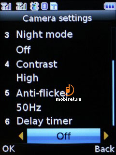 Имеется 3 звука затвора и возможность его отключения. Можно выбрать одну из предустановленных рамок, а также задать место сохранения снимков: память телефона или flash-карта. Помимо этого из меню можно быстро перейти Медиаальбом и настроить место сохранения снимков, телефон или карта памяти. Есть функция сброса параметров до заводских настроек.