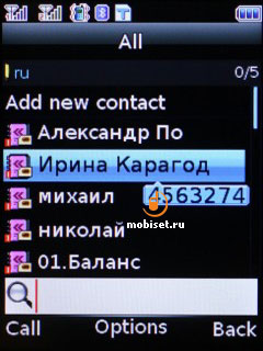 Поиск осуществляется по начальным буквам контакта (имени или фамилии). На экране отображается буква во время прокрутки списка, которая позволяет сориентироваться в общем списке. Работает быстрый набор номера (назначаются до 8 контактов).