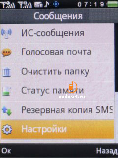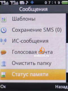 Телефон работает как с SMS-, так и с MMS-сообщениями. В памяти хранятся до 1000 SMS. Входящие SMS и MMS попадают в общую папку. Дополнительно имеются папки отправленных, исходящих и черновиков. Также показываются сообщения, хранящиеся в памяти SIM-карты. Может оказаться и полезной функция автоматической блокировки посланий от неугодных лиц – в папке со спамом будут храниться сообщения от заблокированных пользователей. Имеется набор шаблонов на разные случаи жизни.