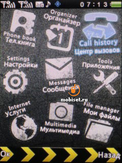 Меню оригинальное, анимированное и красочное. Выбранный пункт выделяется на фоне остальных более крупным значком. Но дополнительных тем оформления в телефоне нет. Назначается фоновая картинка как из числа предустановленных в телефоне, так и тех, что были сохранены в памяти устройства пользователем. Включается анимация на включение и выключение телефона, на рабочий стол выводятся (или отключаются при желании) записанные задачи, имя оператора, дата и время.