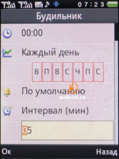 В телефоне 5 будильников. Задаются дни, по которым он будет работать, а также можно выбрать его сигнал либо из числа предустановленных в телефоне мелодий, либо установить свою любимую мелодию. Режим повторной побудки устанавливается на промежутки в 5, 10 и 20 минут. Изменяется режим оповещения (только звук, только вибрация, звук и вибрация, вначале вибрация, потом сигнал).