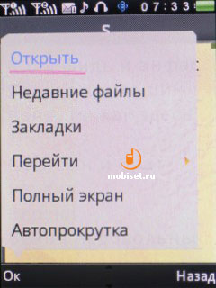Встроенная функция чтения текстовых файлов позволяет ознакомиться с содержимым файлов вида .txt, которые могут быть в кодировках ASCII (Western Windows), UCS2 (Unicode) и UTF8. Для дополнительного удобства настраивается стиль шрифта, его размер (маленький, средний, большой), прокрутка (постраничная или построчная) и ее скорость, отображение текста на весь экран. Также можно установить автоматическую прокрутку текста. Чтение текста осуществляется только в вертикальной ориентации экрана. Данные могут быть расположены как в телефоне, так и на карточке памяти.