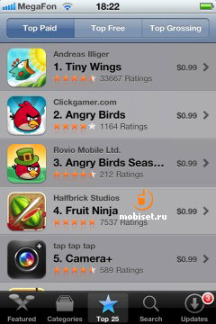 Источник софта как платного, так и бесплатного. Необходима учетная запись, введя данные, приложение позволит приобретать программы и напрямую устанавливать их в iPhone, загружая через Wi-Fi, минуя компьютер. Есть поиск, список рекомендуемых и самых популярных программ, среди которых выделяются платные и бесплатные версии. А также можно получать обновления для установленных приложений. В целях сохранения трафика объемные приложения могут загружаться только при наличии подключения по Wi-Fi.