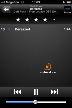 Выбрав интересующий альбом, вы откроете, где отображается обложка, а пол ней – список песен и продолжительность каждой из них. В режиме воспроизведения музыки большую часть дисплея занимает опять-таки обложка альбома, внизу – кнопки управления плеером и полоса регулировки громкости, которая дублирует механические кнопки. Вверху отображается название трека, альбома и имя исполнителя. Выводится номер песни и общее число записей в альбоме. Включается режим повтора песни или альбома, а также случайно воспроизведение. Можно включить Genius, который подберет похожую по стилю музыку. А также можно перейти в другое меню, которое покажет не только список композиций альбома, но и позволит присвоить каждому треку личный рейтинг по пятибалльной шкале.