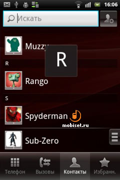 В смартфоне имеется список из букв алфавита, расположенный в правой части экрана. Если нажать пальцем на эту строку и вести вниз или вверх, то на экране всплывает буква – своеобразный быстрый поиск, который помогает в тех случаях, когда в телефоне несколько сотен, а то и тысяч контактов. Работает поиск по первым буквам имени контакта для обеих языковых раскладок. Есть меню избранных номеров, куда можно добавить самые востребованные контакты.