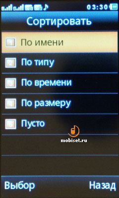 Встроенный файловый браузер умеет переносить файлы из папок в памяти телефона и карты памяти, копировать, переименовывать и удалять их. Создаются папки, пользователю доступна сортировка по имени, типу, времени и размеру. Через него просматривается и прослушивается разнообразный контент. Папки и файлы отображаются вертикальным списком.