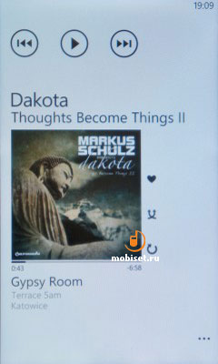 При воспроизведении песни на экране отображается обложка файла. Вверху располагаются три стандартные клавиши управления проигрывателем. Ниже указывается информация об исполнителе, альбоме и название трека. Под именем песни мелким шрифтом указываются названия двух следующих песен. Также здесь имеется сведения о времени воспроизведения и общей продолжительности песни. Однако функции перемотки с помощью строки прокрутки нет, она не работает. Для этого потребуется удерживать клавишу Вперед или Назад, чтобы переместиться к нужному участку.