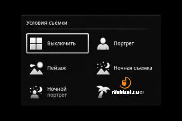 Условия съемки: обычное, портрет, пейзаж, ночная съемка, ночной портрет, пляж и снег, спорт, вечеринка, документ.