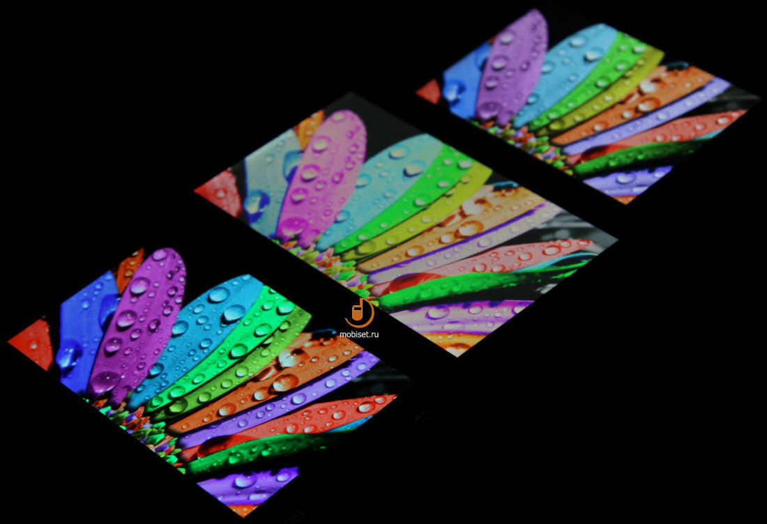 Для сравнения приведу пример того, как Sony Xperia S (в центре) смотрится рядом с Samsung i9070 Galaxy S Advance (слева) и Apple iPhone 4S (справа) на максимальной яркости экрана.