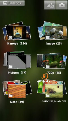 В папках превью картинки меньшего размера, благодаря чему помещается уже не 3, а 5 картинок по вертикали. Изображение открывается на весь экран, работает масштабирование при помощи мультитач. Файлы можно отправлять по электронной почте, Bluetooth, SMS или разместить на Picasa. Можно назначить изображениями в качестве обоев рабочего стола или присвоить контакту. Поддерживается поворот картинок, уменьшение их размера, а также выводится дополнительная информация о конкретном файле, также показывается место, где был сделан снимок в том случае, если работает геотеггинг.