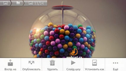 Здесь показываются хранящиеся в памяти смартфона фотографии и видеоролики. Галерея работает как в вертикальной ориентации, так и в горизонтальной. Работа с файлами сопровождается симпатичными анимационными эффектами. Превью картинок генерируются без задержек. Картинки отображаются сеткой 2х3 или 3х2, в зависимости от положения устройства.