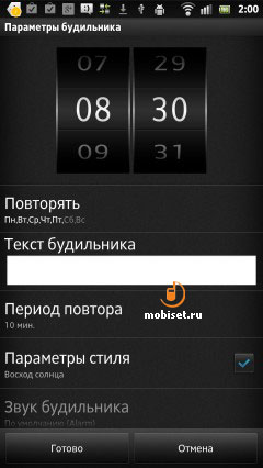 Смартфон позволяет сохранять в памяти несколько будильников. Повтор устанавливается как на 1 раз, так и на каждый день, только на рабочие дни или еженедельно. Также задаются определенные дни. Устанавливается мелодия сигнала, можно добавить к ней виброзвонок и текстовый файл. Задается период повторного срабатывания сигнала.
