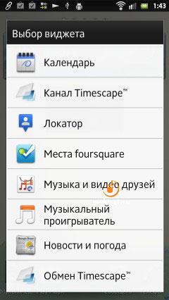 Timescape сочетает в себе вкладки, которые объединяют сообщения из различных социальных сетей: Facebook, Twitter, Вконтакте. Кроме того, имеются данные о телефонных звонках, SMS и MMS, электронной почты. Настраиваются выводимые данные, ненужные можно скрыть. Также устанавливается обновление: вручную или автоматически. Дополнительные приложения устанавливаются из маркета. Так, например, можно дополнить набор программой Foursquare.