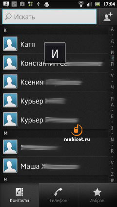В смартфоне имеется список из букв алфавита, расположенный в правой части экрана. Если нажать пальцем на эту строку и вести вниз или вверх, то на экране всплывает буква – своеобразный быстрый поиск, который помогает в тех случаях, когда в телефоне несколько сотен, а то и тысяч контактов. Работает поиск по первым буквам имени контакта для обеих языковых раскладок.