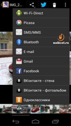 Любой файл из медиатеки может быть отправлен при помощи Bluetooth, MMS или электронной почты. Файл передается по Bluetooth, Wi-Fi Direct, в социальные сети: Facebook, Вконтакте, Одноклассники, Твиттер. Также по мере установки новых приложений сюда могут добавляться новые функции. Смартфон запоминает последнее приложение, использованное для передачи данных, оно будет отображаться первым в предлагаемом списке.