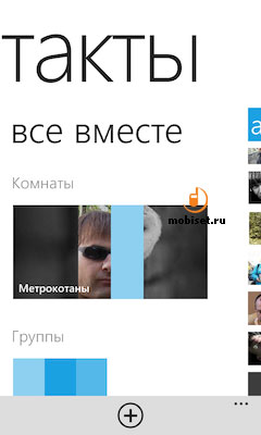Меню поиска поможет найти нужного человека. Телефон позволяет создавать группы пользователей. Они будут отдельно выделены перед общим списком имён. Добавив в каждую группу пользователей, можно следить за жизнью друзей, видеть их сообщения, снимки. Конечно же, можно написать письмо, SMS или позвонить им отсюда. Появилась функция «Комнаты», которую можно считать примеров классической группы контактов, но с расширенной функциональностью: тут легко пообщаться с ограниченным кругом людей, обмениваясь картинками, записями календаря или заметками. Причем в такую группу включаются не только пользователи WP-смартфонов, но и владельцы других устройств.