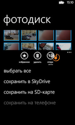 Выбрав нужный объект, он открывается на дисплее. Можно менять масштаб картинки мультитачем или двойным нажатием. Любое изображение можно установить в качестве обоев экрана блокировки, отправить по MMS, электронной почте, поместить в Facebook или Twitter или загрузить в SkyDrive. Также изображение добавляется в число избранных, открывается с помощью программы для редактирования. Картинку можно передать и при помощи приложений, например, загрузить в твиттер через дополнительный клиент.