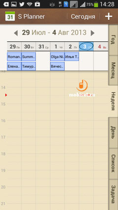 Сбоку открывается вкладка с категориями: год, месяц, неделя, день, повестка дня, задача. Она помогает быстро передвигаться по календарю. Смартфон помогает добавить дополнительные данные, используя Google, Facebook, Exchange для синхронизации событий. Новой записи присваивается название, интервал, повтор (однократное, ежедневное, каждый будний день, еженедельное, ежемесячное, ежегодное). Устанавливается напоминание, которое сработает предварительно. Дополнительное прилагается картинка или заметка.