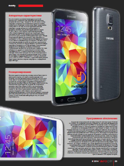 Самая интересная с точки зрения тематики портала Mobiset.ru рубрика носит имя Mobility. Здесь друг за другом следуют двухстраничные обзоры актуальных устройств – сначала селфифона Sony Xperia C3, затем Galaxy S5 mini. Тестирование последнего поделено на пять блоков: перечень технических характеристик, дисплей и дизайн, аппаратные характеристики, позиционирование и программное обеспечение. На первый взгляд, расстраивает отсутствие блока «Выводы», на деле же впечатления фиксируются в подразделе, раскрывающем позиционирование гаджета. Например, рассуждая о невысокой функциональности Samsung Galaxy S5 mini, автор приводит доводы, почему Samsung не создаёт конкуренции между флагманом и его mini-версией, и доводы вполне убедительные.