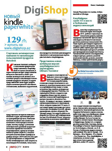 Обложка «инфосити» не поражает воображение дизайнерскими изысками, в то же время это уже не уровень иллюстратора-одиннадцатиклассника. Обычная обложка с QR-кодом – технологии таки дошли до журнала о технологиях! В моих руках 82-й выпуск – то есть издаётся Infocity без малого семь лет, и, в отличие от российских аналогов, свежие номера выходят до сих пор! Вы удивитесь, узнав, что главным устройством августовского выпуска выбран Alcatel One Touch Idol (анонс «Idol на рынке смартфонов»). Неужели Alcatel поработил азербайджанский рынок?