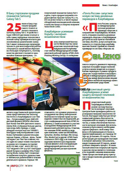Далее описываются новинки августа - LG G3, Xiaomi Mi 4, Fly Era Nano 6, Nokia Lumia 530, ZTE Nubia Z7, Alcatel One Touch Pop C2 и даже голографический смартфон Takee 1. Подача информации прилежная – обязательно расскажут о месте новинки в модельном ряду, иногда – о конкурентах, не забудут указать предполагаемую стоимость, и всё в дополнение к подробному перечню технических характеристик. Обращает на себя внимание набор устройств – в Азербайджане представлены те же марки, что в России, даже если речь идет о брендах второго эшелона – имена Huawei, Xiaomi, Fly, Alcatel, ZTE встречаются в журнале не раз.